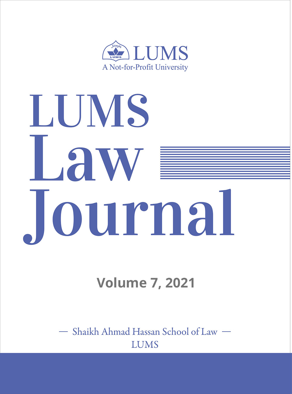 LUMS Law Journal is a peer-reviewed journal of Shaikh Ahmad Hassan School of Law, Lahore University of Management Sciences. The primary aim of the Journal is to provide a forum for scholarly debates amongst law students, faculty, lawyers, judges, practitioners and experts on important legal issues, which may lead to policy reforms. This Journal is an endeavor to foster a profound understanding of contemporary legal issues among its readers. While maintaining all the standards of academic legal scholarship and integrity, this Journal seeks to inform public discourse by publishing articles that are intellectually rigorous and thought provoking. It aims at providing its readers with a detailed, advanced and an insightful legal analysis of various ongoing developments in the legal arena in Pakistan and abroad. It is intended to stimulate interest in all matters pertaining to law, with an emphasis on matters arising from the relationship of law to other disciplines.